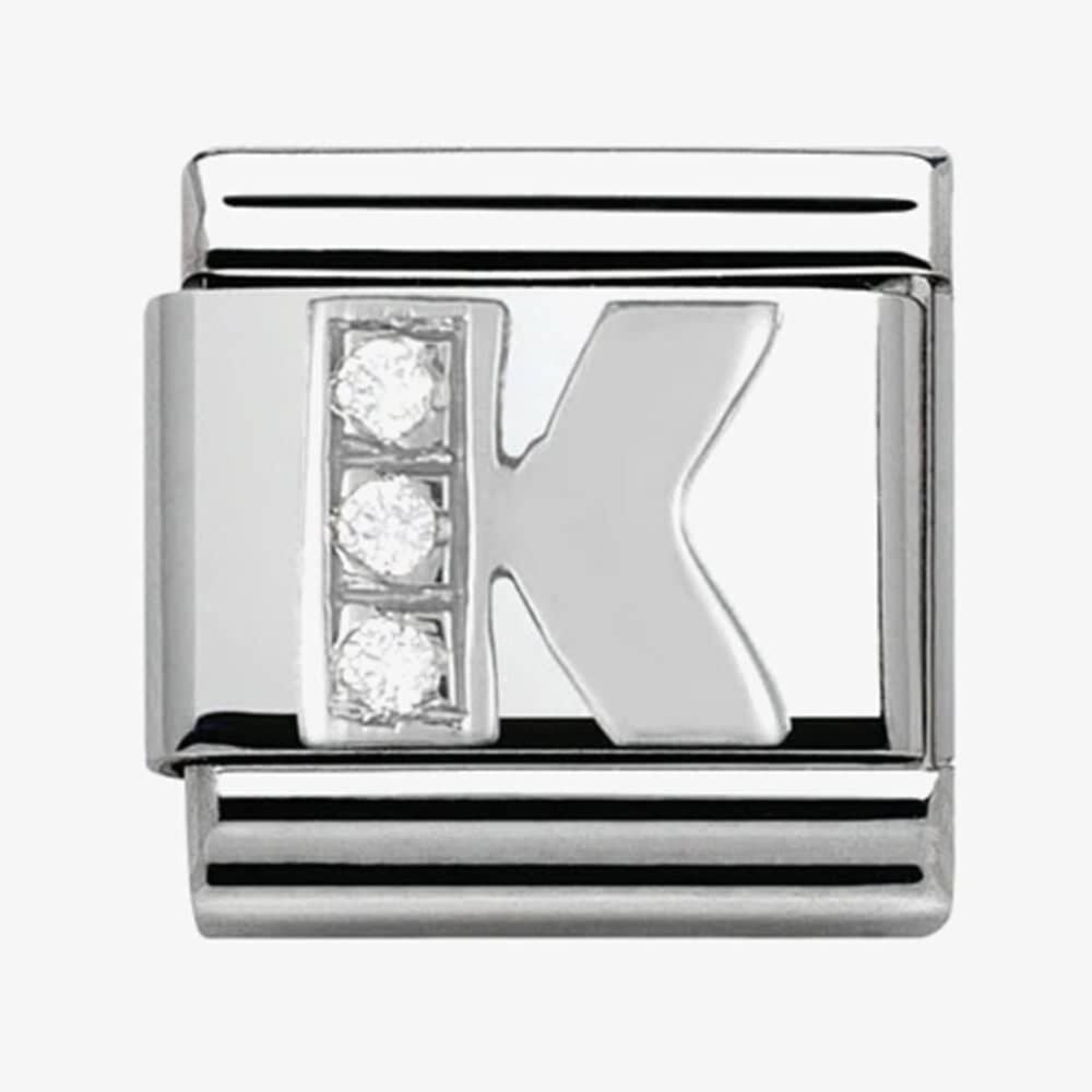 Original Alphabet Charm for Nomination's Composable Classic Bracelet with Letter K in stainless steel, sterling silver and Cubic Zirconia. Available Charm versions: A-Z. Made in Italy.