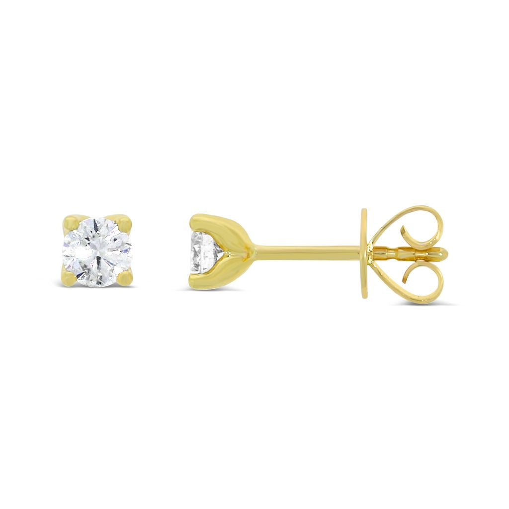 These dainty stud earrings are crafted in 9ct yellow gold, and feature round cut claw set .50ct diamonds. Secured with scroll and post closure.