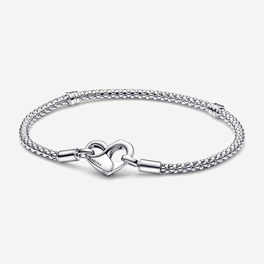 Update your collection with our new Pandora Moments Studded Chain Bracelet. Hand-finished in sterling silver, this bracelet features a flexible, textured chain and an infinity-detailed openable heart-shaped clasp with an interior infinity symbol. Please note: a maximum of 14-18 charms, dangle charms or pendants can be styled among the three sections divided by the threaders.