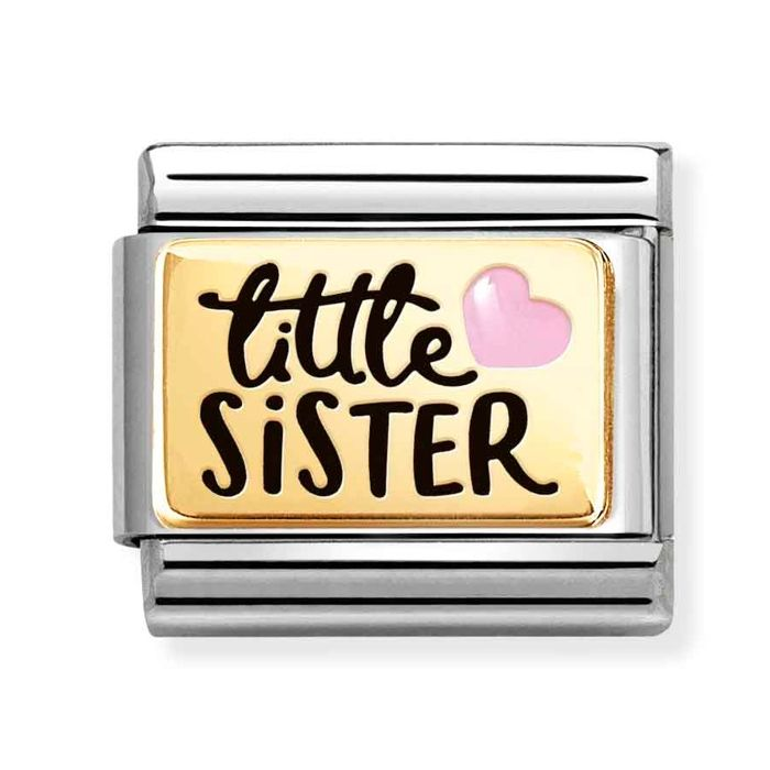 Original Nomination Classic Link in stainless steel and bonded yellow gold decorated plate with LITTLE SISTER in black enamel and Heart with pink enamel, applied by hand. Choose this Link to celebrate a special Link and gift it to your sister side kick.