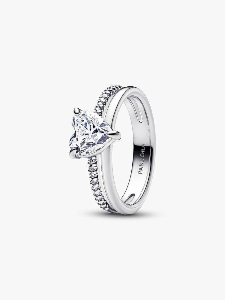This ring features a heart-shaped cubic zirconia, set in the centre of a polished band and a pavé band. The bands are held together by the heart, creating a meaningful ring that celebrates the bonds that connect us.