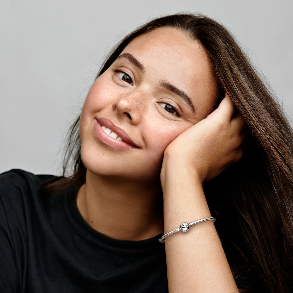 Sleek and elegant, this Pandora Moments bangle is simply beautiful. Crafted in polished sterling silver, it is finished with an embossed ball clasp. Wear this Pandora bangle on its own or create your dream bracelet by adding your personal collection of Moments charms.