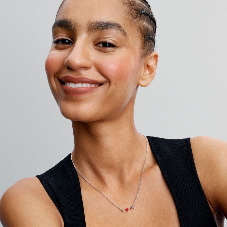 Featuring a red Murano glass heart at the centre of a Cupid's arrow, this necklace sparkles with four clear cubic zirconia stones along the arrow's fletching, forming a universal symbol of love. Wear it alone or layer it with other necklaces for a personalised stack. With an adjustable length of 40, 45, or 50 cm, it's perfect for any neckline.