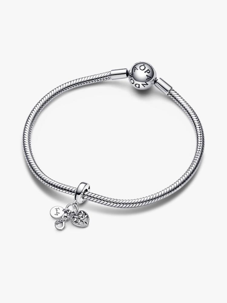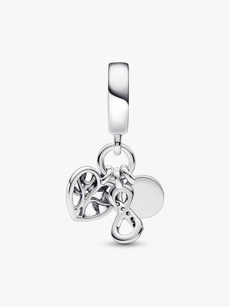 Crafted in sterling silver, this triple dangle charm features a family tree inside an openwork heart, a sparkling pavé infinity sign and a disc engraved with "Family". Three powerful symbols of closeness and everlasting love in one piece of jewellery.