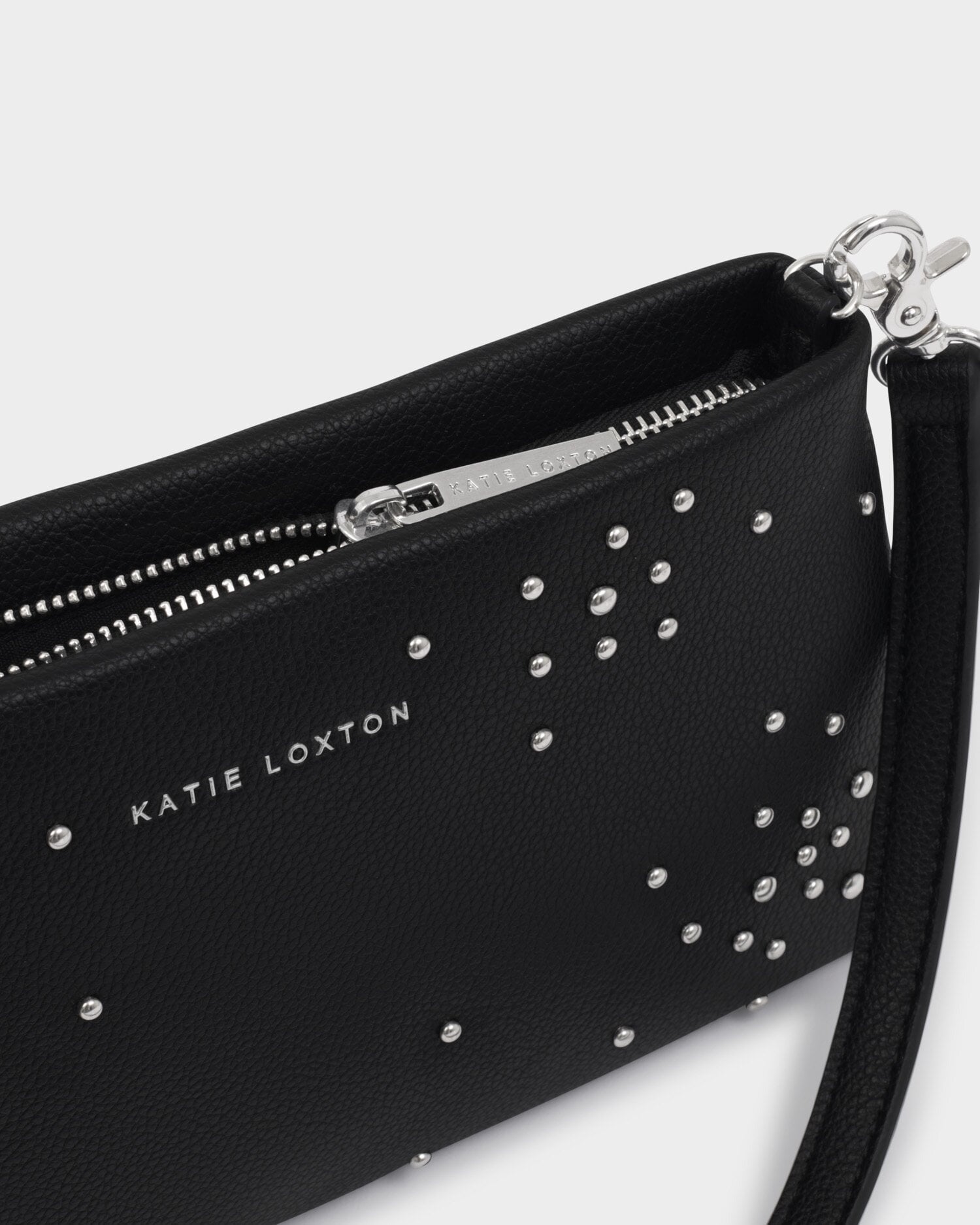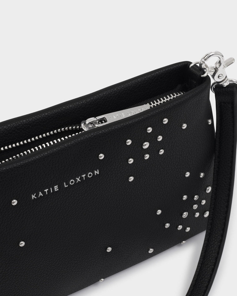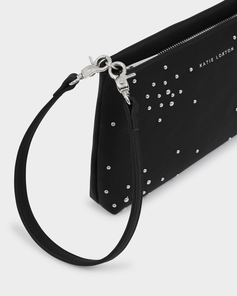 Showcasing domed silver studs in a starburst design, our Nova Wristlet Clutch in Black is a versatile must-have for your party season wardrobe. Featuring a multi-way strap, it easily transforms into a shoulder bag or wristlet to suit any occasion.