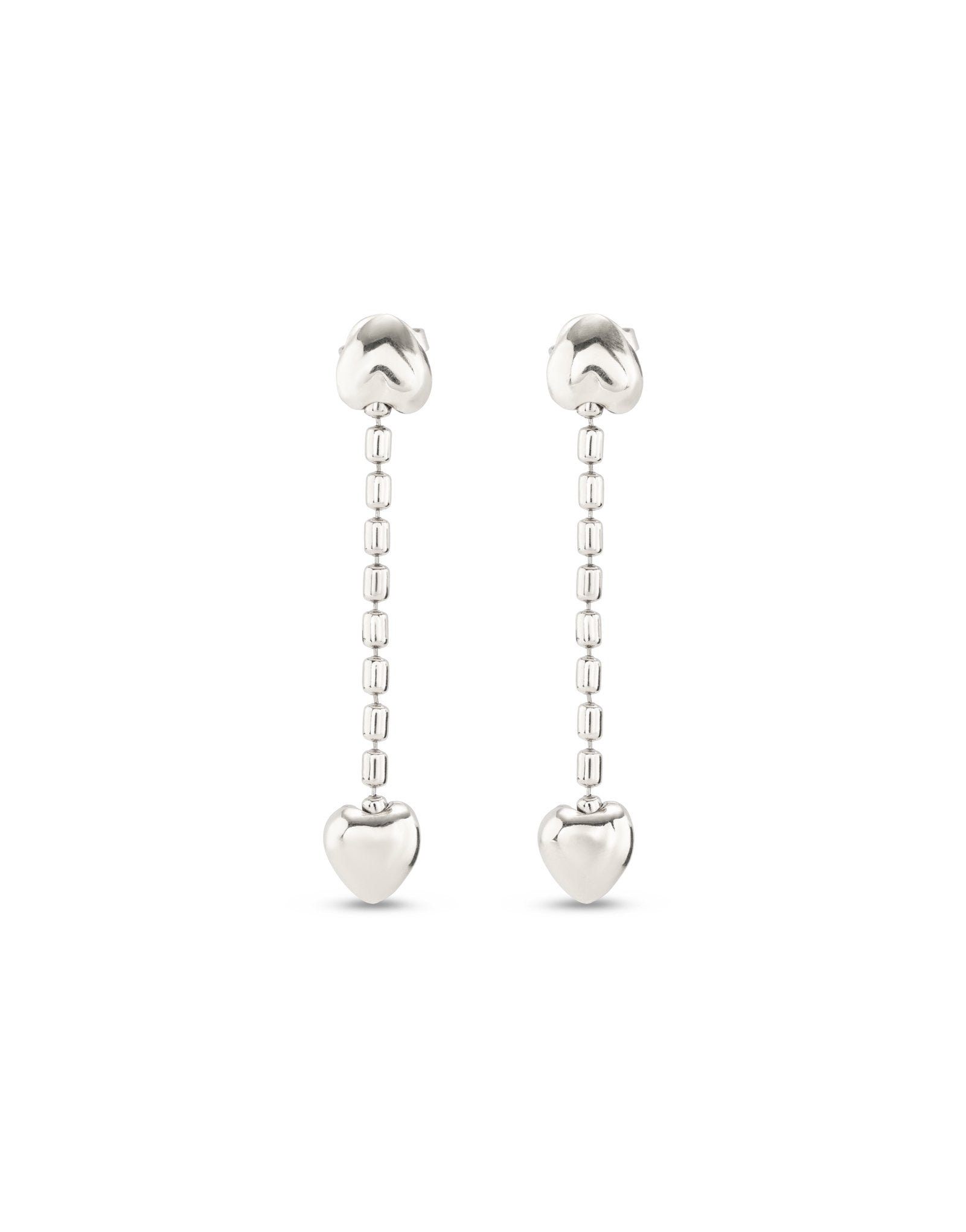 Sterling silver-plated earrings with leather pendant chain and two small silver-plated hearts. Jewel 100% handmade in Spain.