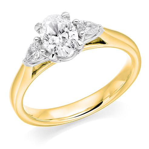 This 18ct yellow gold trilogy ring features a central 0.50ct oval cut diamond, graded G colour and VVS2 clarity. The side diamonds total 0.20ct and are pear cut with a grade of G SI. All diamonds are secured by platinum claws and set on a yellow gold wed-fit band to allow a wedding ring to sit perfectly alongside. Ring size M.