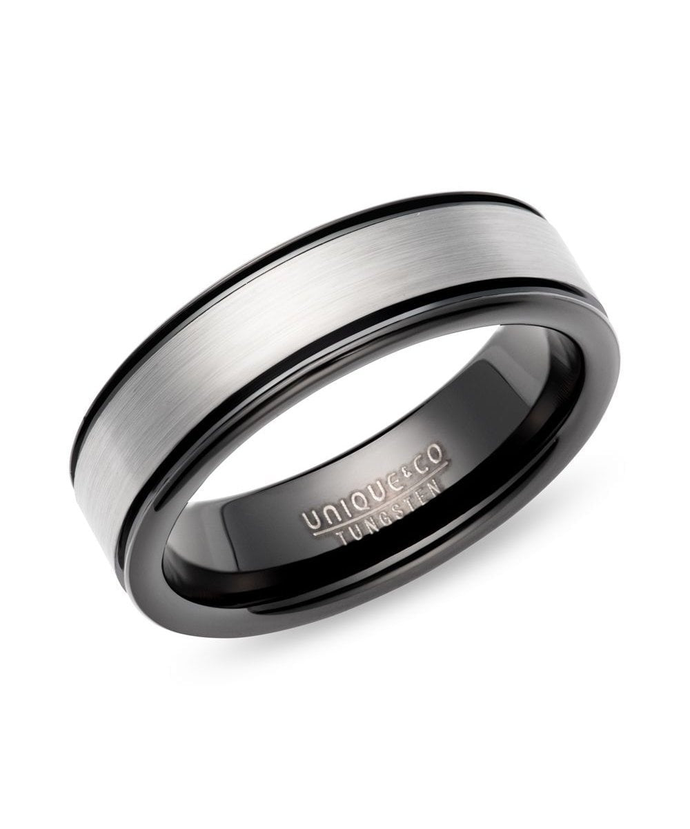 This stunning ring is made from Tungsten Carbide for unbeatable strength and durability. It features a brushed finish centre with polished bevelled edges and inner in a black finish. Perfect as a wedding ring or dress ring.