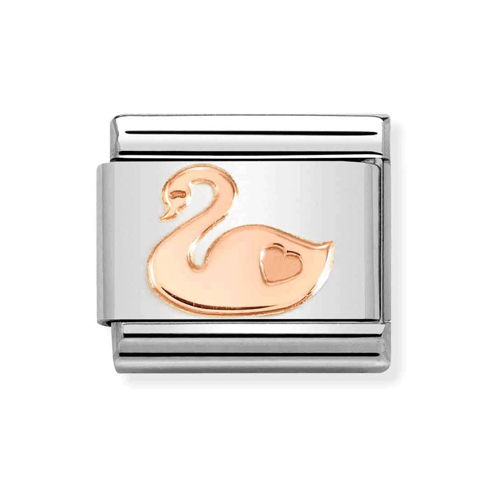 Original Nomination Classic Link in stainless steel and 9K rose gold with Swan with Heart symbol. Made in Italy. The new edition of the Composable RoseGold Collection has a vast array of Links with symbols: animals, good fortune and positivity - Choose your favourites.