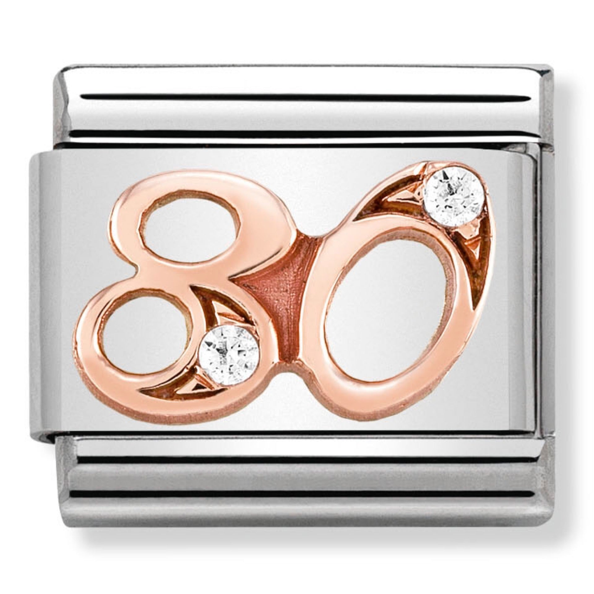 Original Nomination charm for the Composable Classic bracelet with number 80 in stainless steel, 9K rose gold and Cubic Zirconia. Made in Italy. Happy birthday grandparents: Celebrate their birthday with Nomination.