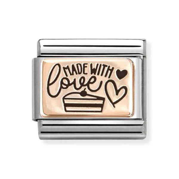 Original Nomination Classic Link in stainless steel and bonded rose gold decorated plate with MADE WITH LOVE with Cake Slice and Heart in black enamel. For all the Queens and Kings of cake design out there, for the chocolate lovers, the cream and icing fans for every person that fills each slice with love and creativity, this Link is for you!