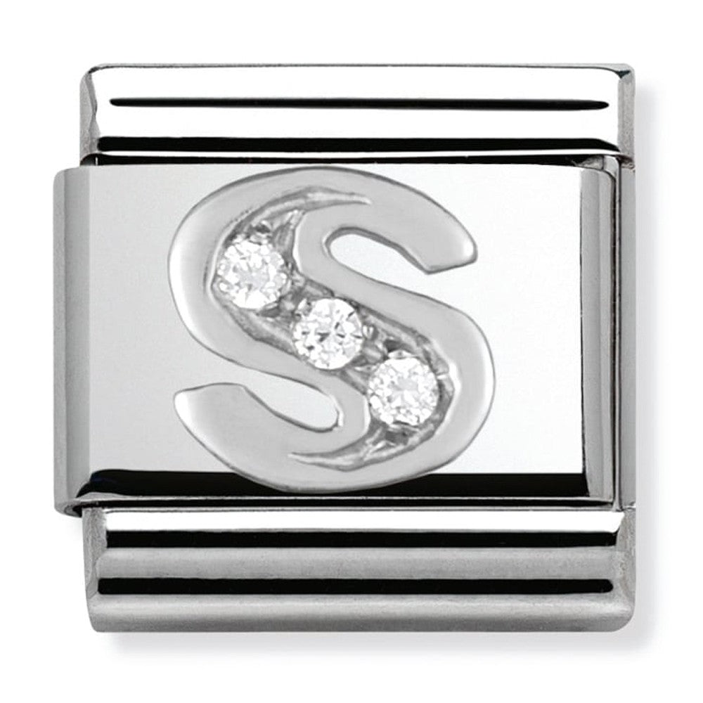 Original Alphabet Charm for Nomination's Composable Classic Bracelet with Letter S in stainless steel, sterling silver and Cubic Zirconia. Available Charm versions: A-Z. Made in Italy.