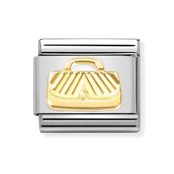 Original Nomination Classic Link in stainless steel and 18K yellow gold with Bag with Etched Detail. Made in Italy. A symbol with etched details to reflect light and enhance the brilliance of your jewellery.