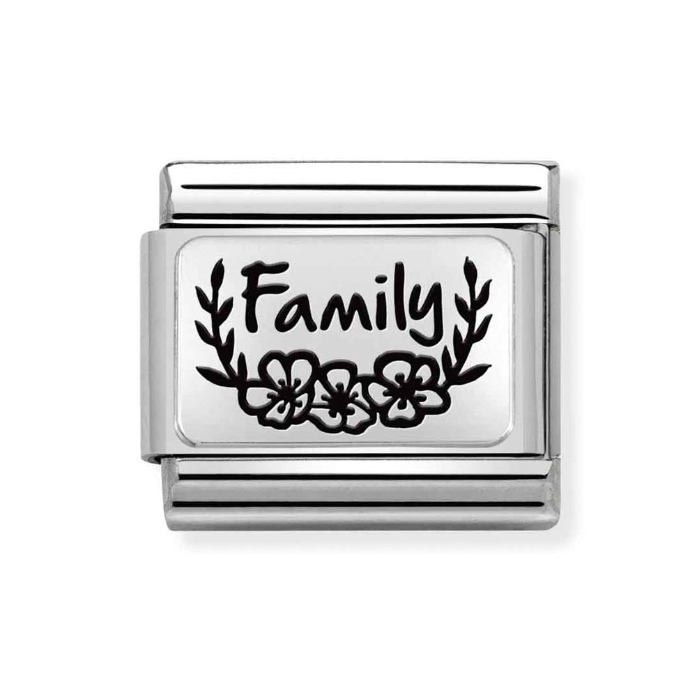 Original Nomination Link for Composable Classic Bracelets in stainless steel and sterling silver with FAMILY with flowers text and symbol in Black engraving. Made in Italy. A family is defined by unconditional love and support, celebrate everyone you consider family with this Link.