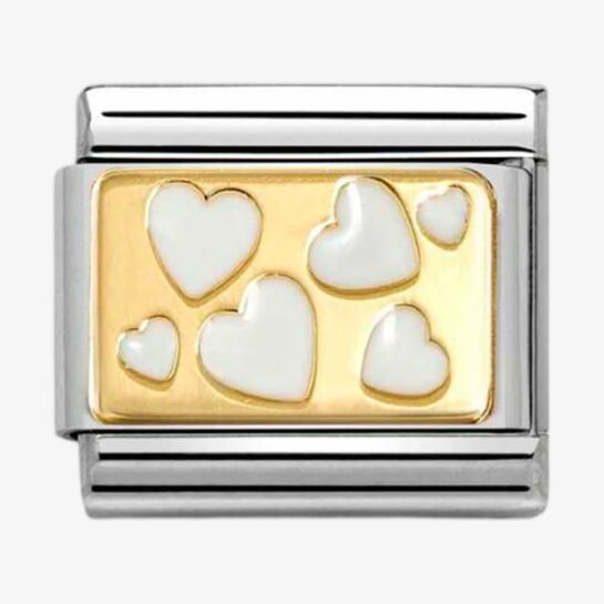 This Nomination classic collection charm showcases a stainless silver base with 18ct gold, adorned with white enamel hearts. A delicate and elegant addition to any bracelet.