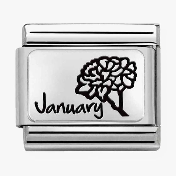 The Nomination CLASSIC Composable Plates January Flower Charm 330112/13 features a sterling silver plate with the wording January and a carnation flower design in black enamel detailing which is set on a stainless-steel base.