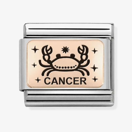 The Nomination CLASSIC Composable Plates Cancer Charm 430112/04 features a bonded rose gold plate with the wording Cancer & the Star sign motif in black enamel detailing which is set on a stainless-steel base.