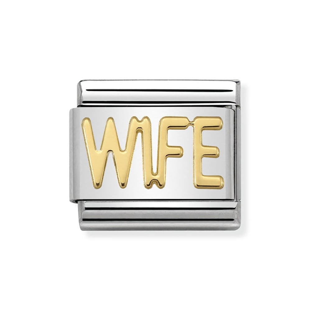 Original Charm for Composable Classic Nomination Bracelet with WIFE writing in stainless steel and bonded yellow gold. Available in several Writing symbols. Made in Italy. The perfect anniversary gift.