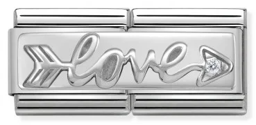 Original Charm for the Classic Composable bracelet in stainless steel, sterling silver and Cubic Zirconia with "Love" written out and an Arrow symbol. Made in Italy.