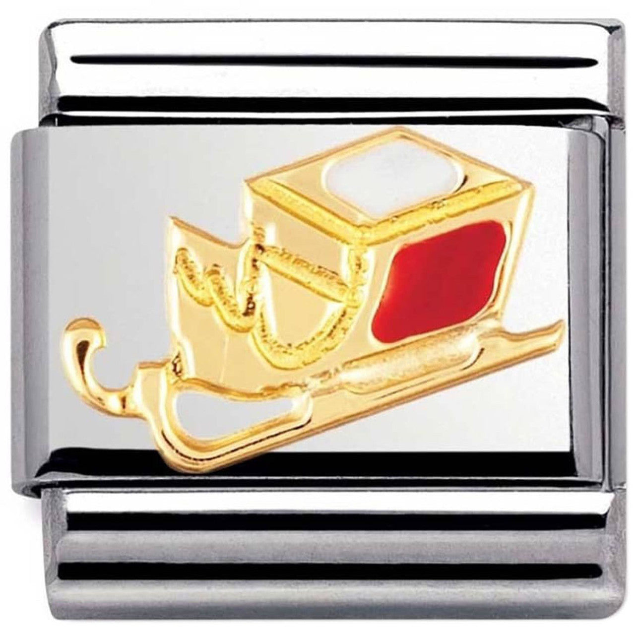 Original stainless steel Charm for Nomination's Composable Classic Bracelet with details in bonded yellow gold and enamel. Red and white Sleigh. Made in Italy. Several Christmas symbols are available.