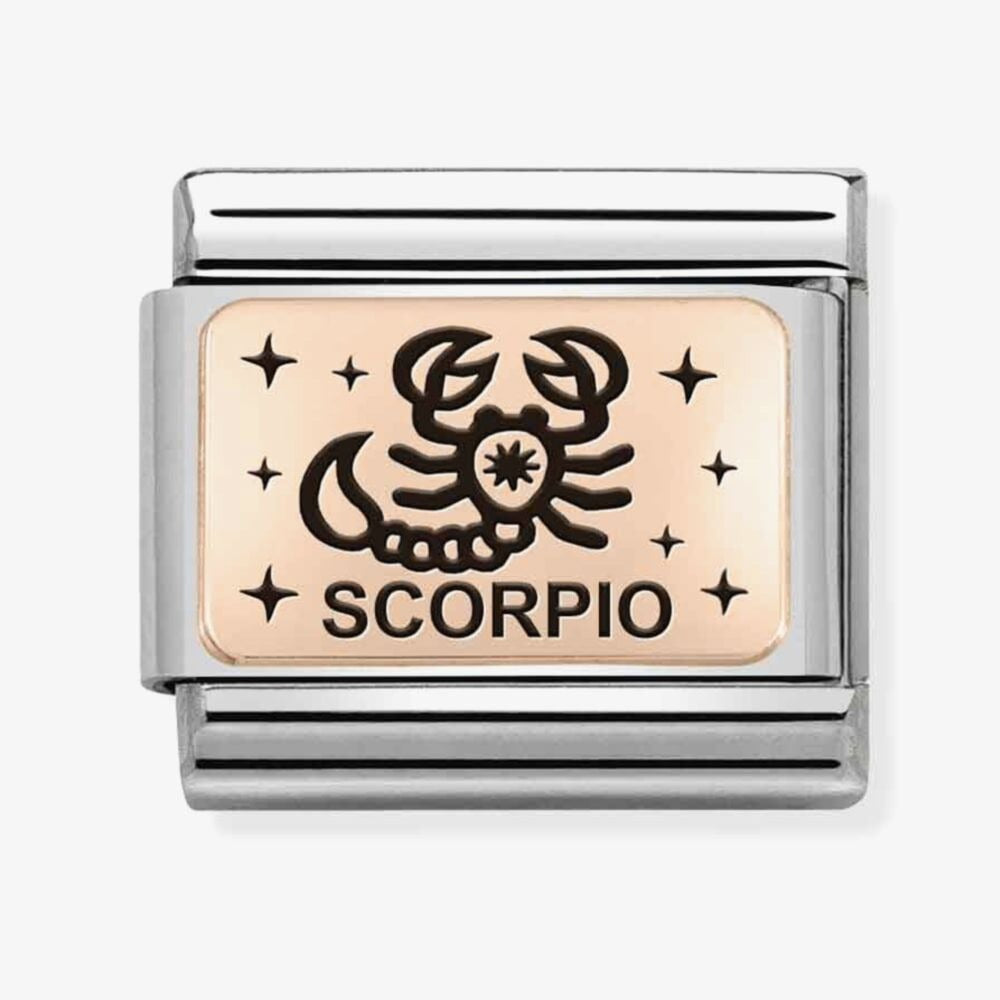 The Nomination CLASSIC Composable Plates Scorpio Charm 430112/08 features a bonded rose gold plate with the wording Scorpio & the Starsign motif in black enamel detailing which is set on a stainless-steel base.