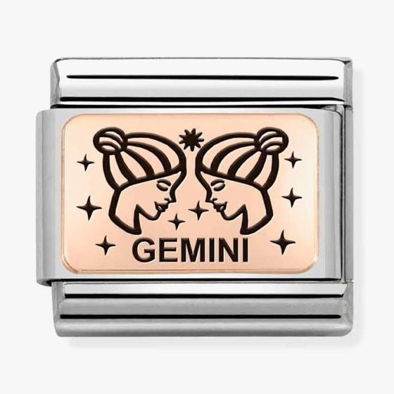 The Nomination CLASSIC Composable Plates Gemini Charm 430112/03 features a bonded rose gold plate with the wording Gemini & the Star sign motif in black enamel detailing which is set on a stainless-steel base.