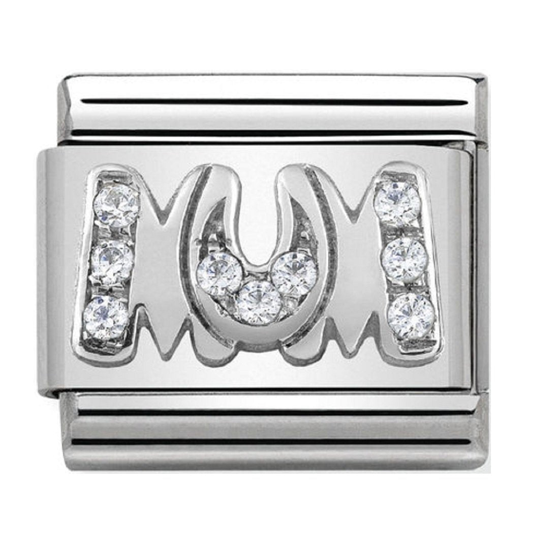Original stainless steel Charm for Nomination's Composable Classic Bracelet. Details in sterling silver and Cubic Zirconia. Charm from the My-Family Composable Collection. Tell your Mum that you love her with a precious Charm.