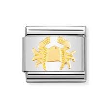 Original Zodiac Charm for Nomination's Composable Classic Bracelet with Cancer symbol in stainless steel and bonded yellow gold. All Zodiac symbols are available. Made in Italy. Cancer is a water sign: Sensitive, friend-oriented, practical.