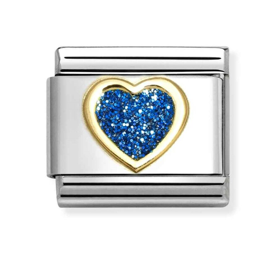 Original Nomination Classic Link in stainless steel and 18K yellow gold with Heart symbol with Blue Glitter. Made in Italy. Your first glitter Heart Link should be the one in your favourite colour!
