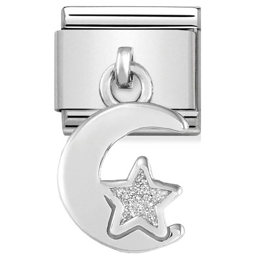 Original Pendant link for bracelet in sterling silver Moon and Star with White Glitter. Made in Italy. The pendant link that captures the magic of the Man in the moon and his Lady star.