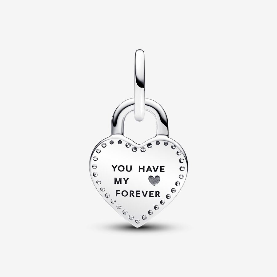Unlock a secret message of love. This double dangle charm features two heart-shaped discs: a 14k rose gold-plated disc with a keyhole cut-out, and a sterling silver disc with a twistable bar. Twist the bar to reveal a "YOU HAVE MY ♥ FOREVER" engraving.