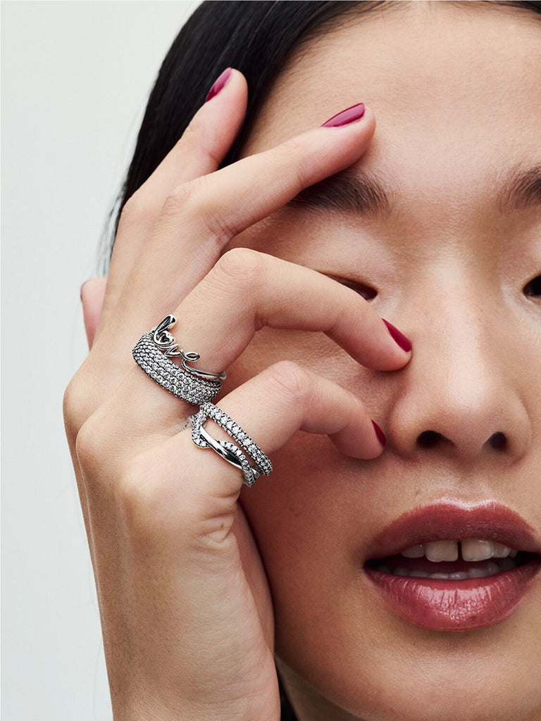 A new wave of stacking. Inspired by the movement of ocean waves, this sterling silver ring features a smooth polished band with a sparkling pavé band entwined around it. Stack it with other wave rings for a contemporary look you’ll love for years.