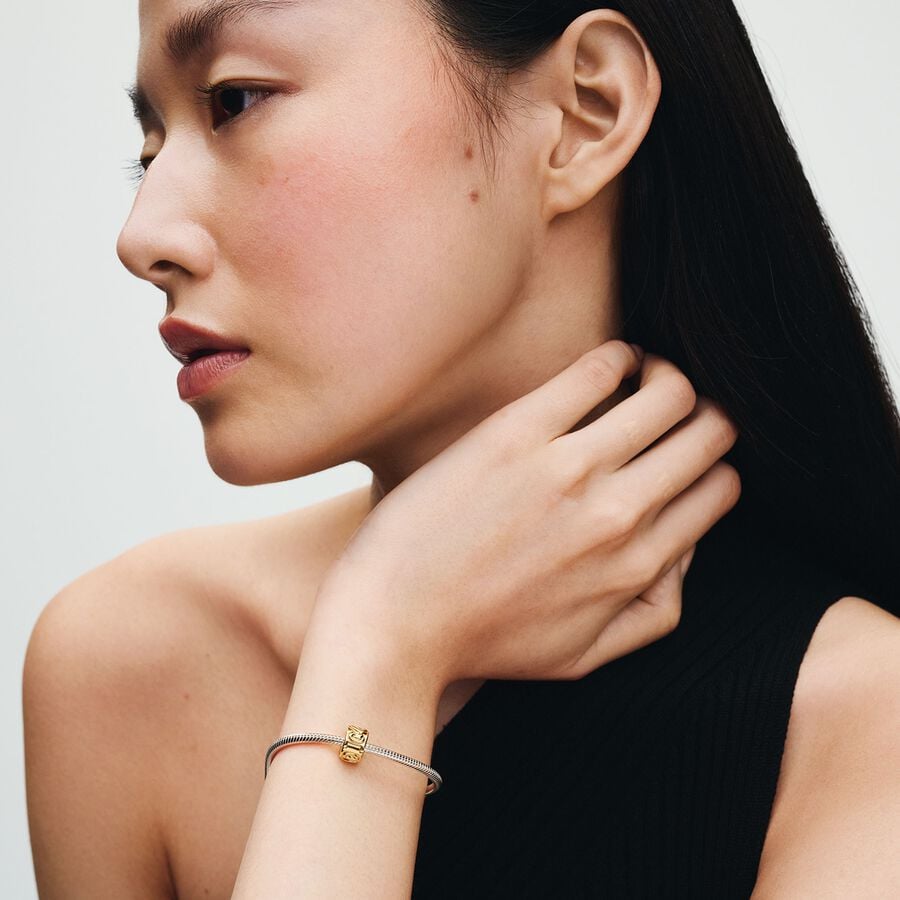 Our simple yet striking Pandora Moments clip charm is decorated with a row of knotted hearts. The design features a combination of the iconic heart and the classic love knot, which gives the piece extra emotional appeal. This clip charm features no silicone grip, so it will slide if not styled onto threads (two raised charm dividers).