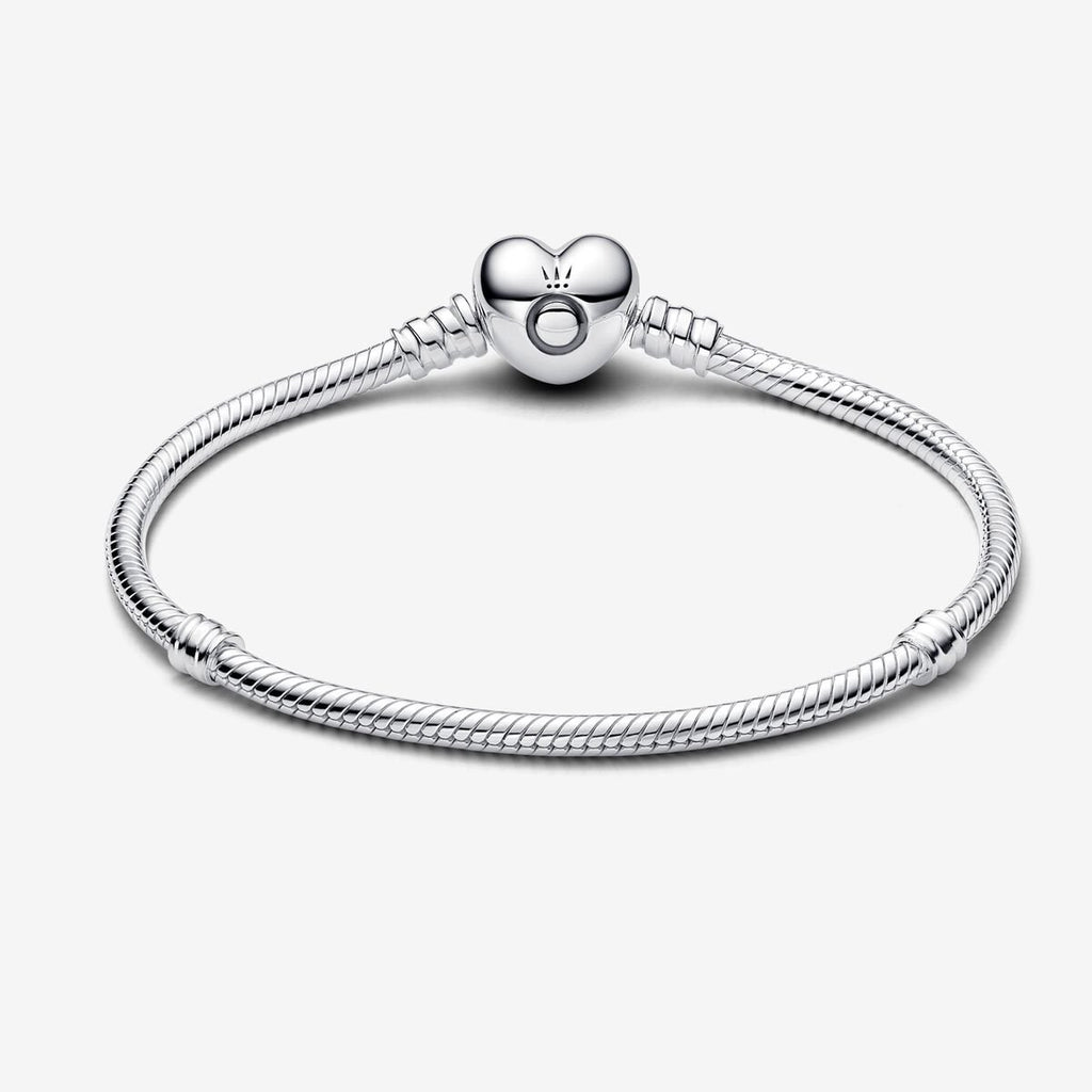 Set your heart a-flutter with this romantic version of Pandora's bestselling charm bracelet. Hand-finished with a heart-shaped clasp, this sterling silver snake chain bracelet looks stunning on its own but even better adorned with your favourite Pandora charms and clips. Layer it with contrasting Pandora chain bracelets for a chic, multi-layered look.