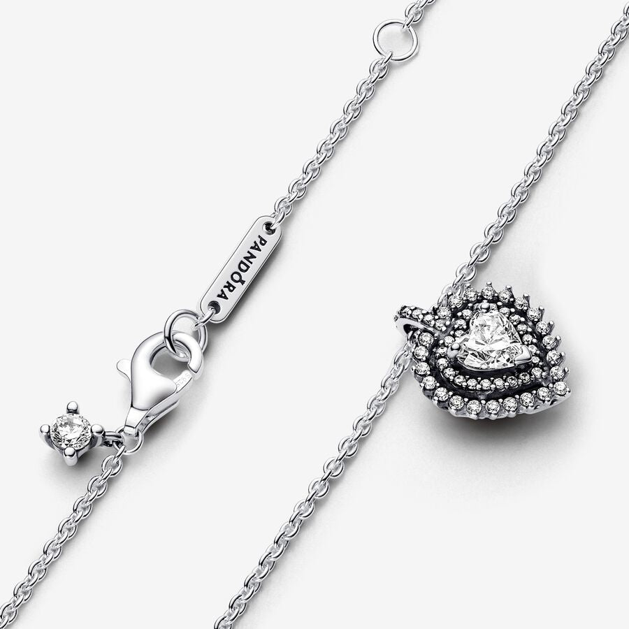 Express the depth of your love with the Sparkling Heart Halo Pendant Necklace. This elegant sterling silver necklace features a heart-shaped cubic zirconia stone sparkling at its centre. A double halo set at different levels around the stone adds a sense of depth and dimension. The heart pendant is not detachable and slides freely along the chain, which is adjustable to three lengths. Pair it with the matching Sparkling Heart Halo Stud Earrings to create an elevated and modern look.