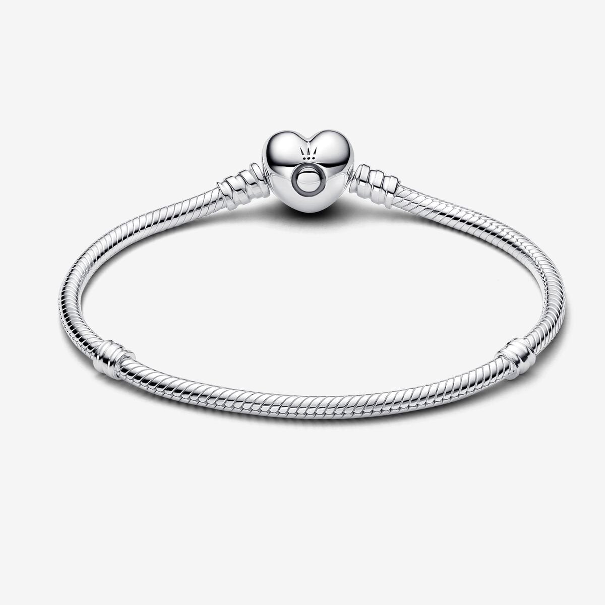 Set your heart a-flutter with this romantic version of Pandora's bestselling charm bracelet. Hand-finished with a heart-shaped clasp, this sterling silver snake chain bracelet looks stunning on its own but even better adorned with your favourite Pandora charms and clips. Layer it with contrasting Pandora chain bracelets for a chic, multi-layered look. n Item: 590719-17n
