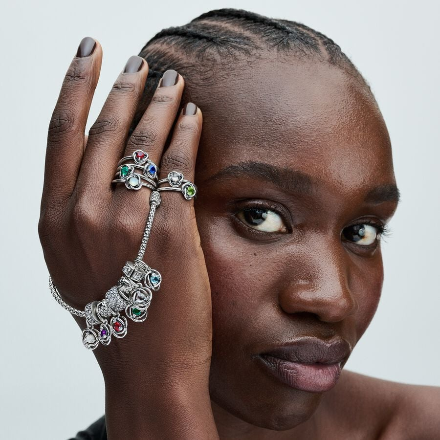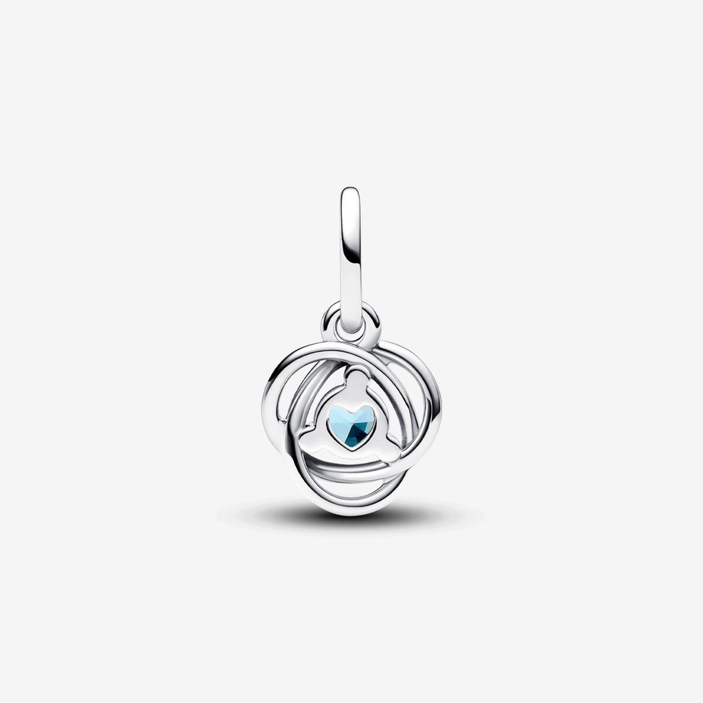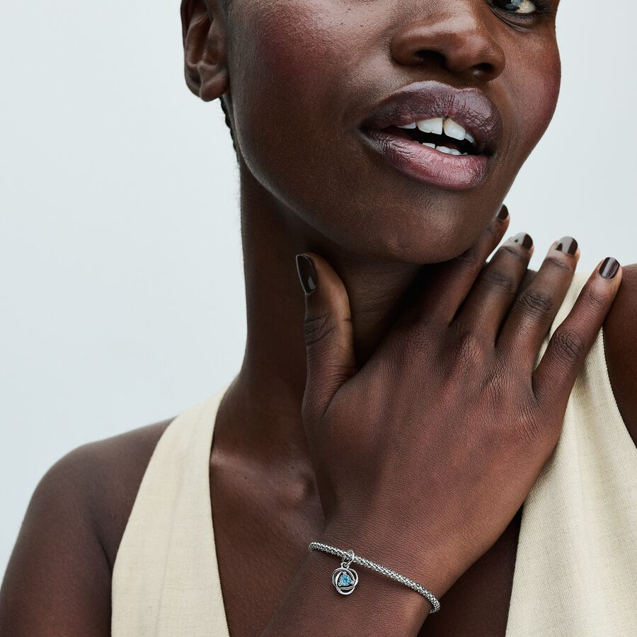 This intricate Sea Aqua Blue Eternity Circle Dangle Charm is a must-have infinity charm for your Pandora Moments collection. Crafted in lustrous sterling silver, it features an openwork infinity braid decorated with a central sea aqua blue man-made crystal, elegantly surrounded by three clear cubic zirconia. The intricate design symbolizes eternity and adds an additional layer of meaning to the piece. Elevate your bracelet with this timeless piece or gift it as a representation of an everlasting bond.