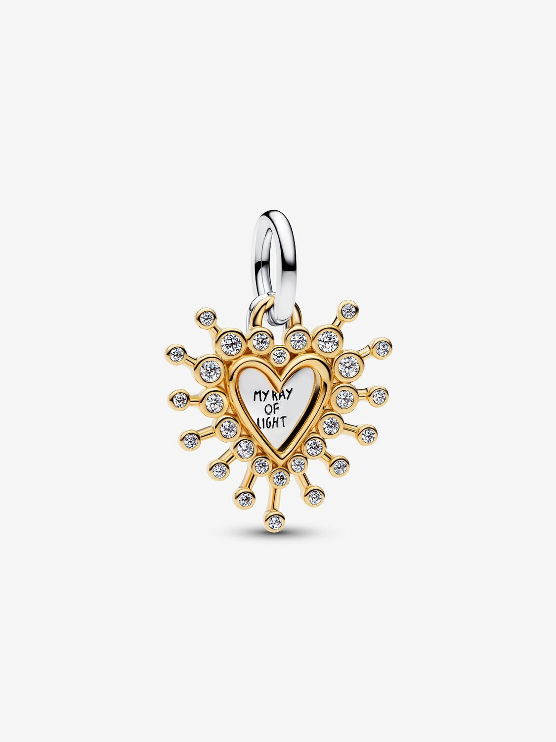 Illuminate your look with this two-tone dangle charm. The design features one openwork heart encircled by radiant rays and one with a hidden engraving that reads 'MY RAY OF LIGHT'. Keep it. Share it. Shine together.