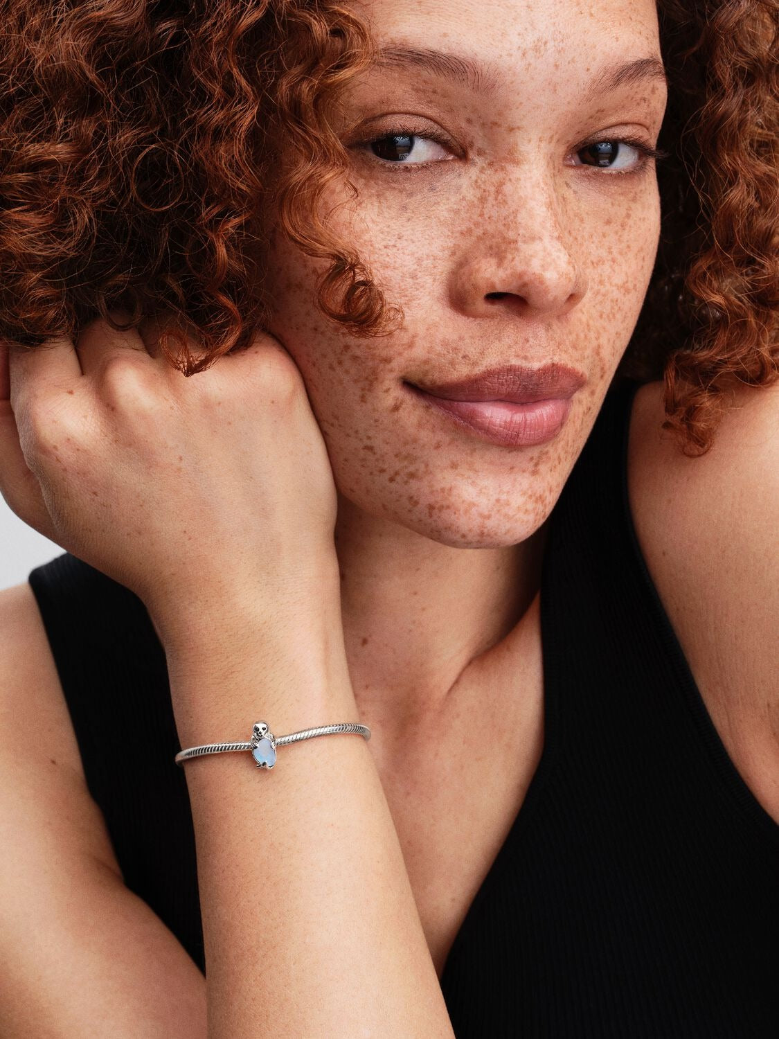 Dive into the magic of the sea. This sterling silver charm features a seal with sparkling man-made crystal eyes hugging a glowing iceberg made from moonstone iridescent glass. A tiny reminder to hold close what matters.