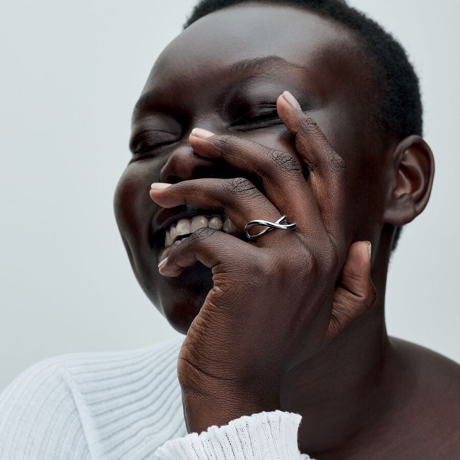 Bring dimension to your look when you wear the Organically Shaped Infinity Ring. This sterling silver ring splits into two overlapping bands, connected at the back. Both bands have a with a slight wave and varied width for an undulating, organic look. Embodying the beauty found in nature's organic shapes, this ring will add an architectural element to your look. Pair it with other sterling silver styles for monochromatic minimalism or use it as the foundation for your next maximalist stack.