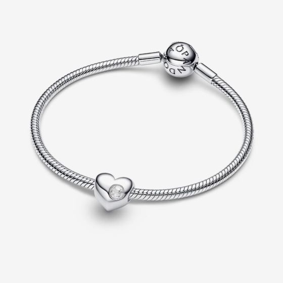 Celebrate April with Pandora's Sterling Silver White Cubic Zirconia Birthstone Heart Charm. Crafted from polished sterling silver, this timeless heart-shaped charm features a sparkling white cubic zirconia stone, representing the April birthstone and symbolising purity and strength—perfect for a meaningful touch of elegance.