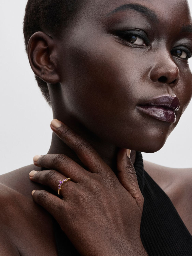 Show your love for Disney’s Frozen with our 14k gold-plated tiara ring. Inspired by Queen Anna's warmth and bubbly spirit, this ring features a constellation of violet-coloured stones that reflect the light.
