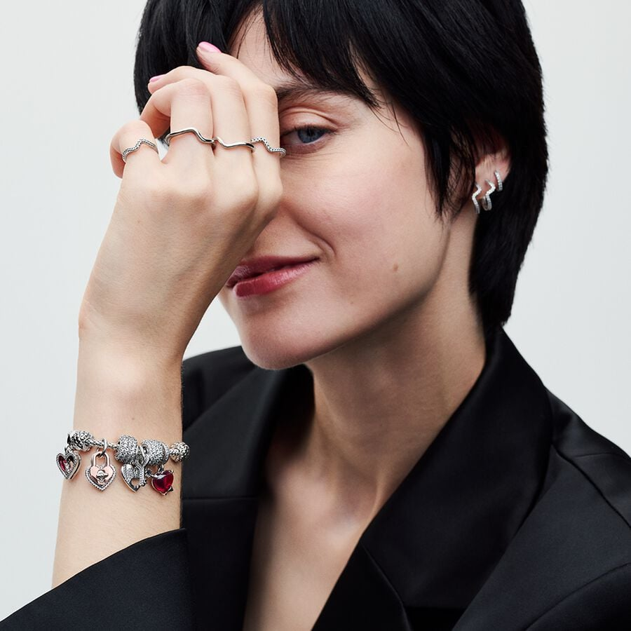 Gift a gesture of love with the Red Heart & Keyhole Double Dangle Charm. This sterling silver charm features a pavé-set heart outline with a tiny keyhole-shaped dangle in the centre. Behind it is a heart-shaped disc with vibrant red enamel and a cut-out that matches up perfectly with the keyhole dangle. On the back is the engraved message "My love is yours". The perfect addition to your special someone's Pandora Moments bracelet or charm holder.