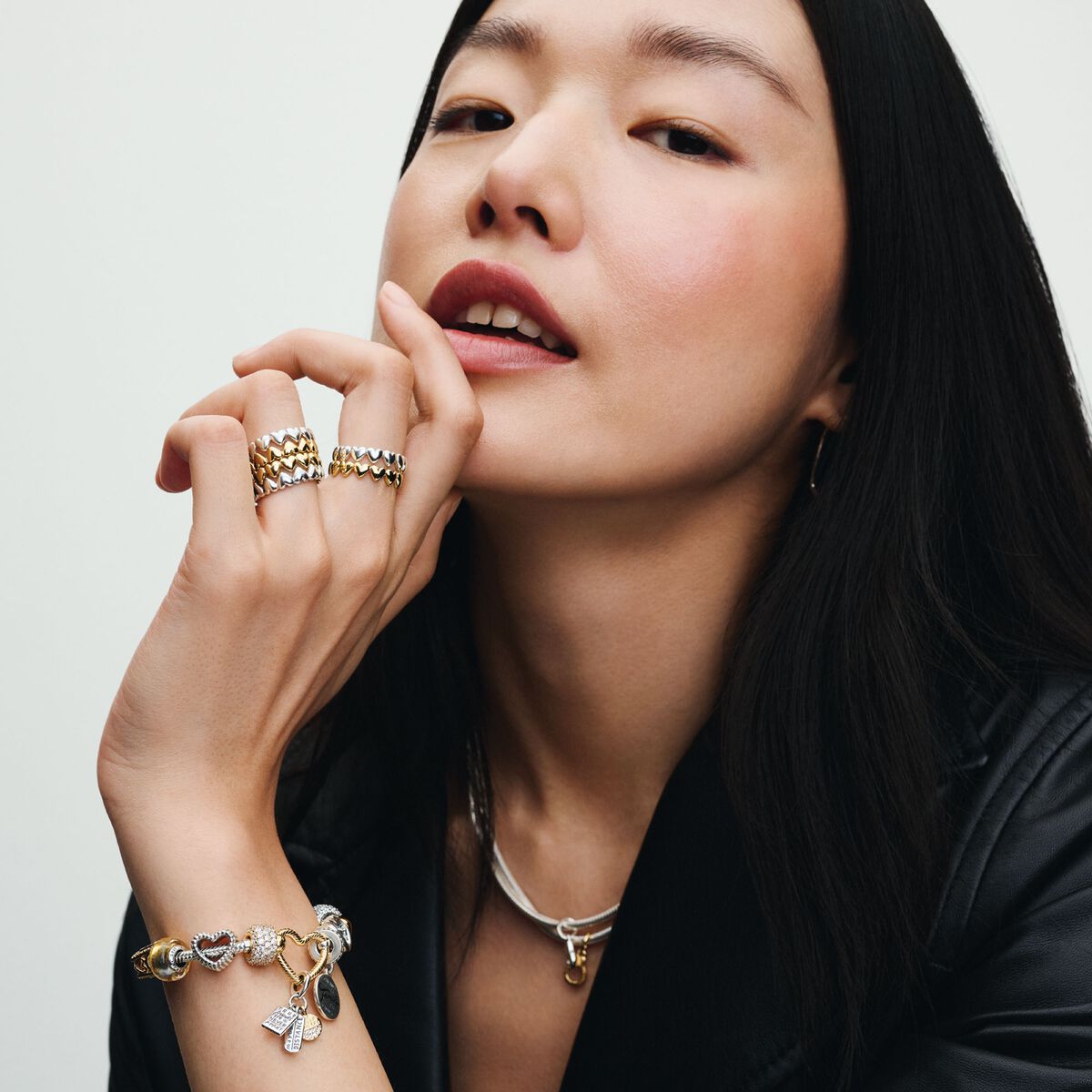 Give a gift from the heart with this 14k gold-plated ring. Expertly crafted with a row of hearts making up the band, this romantic design looks equally beautiful worn on its own or layered with contrasting Pandora rings.