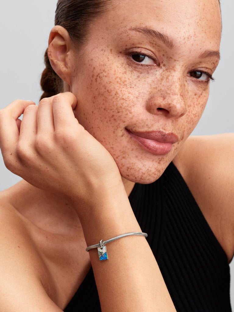 Explore the world with a symbol of freedom and adventure. This travel-themed charm is designed to inspire your journey, with a unique blend of white and blue lab-created opal.