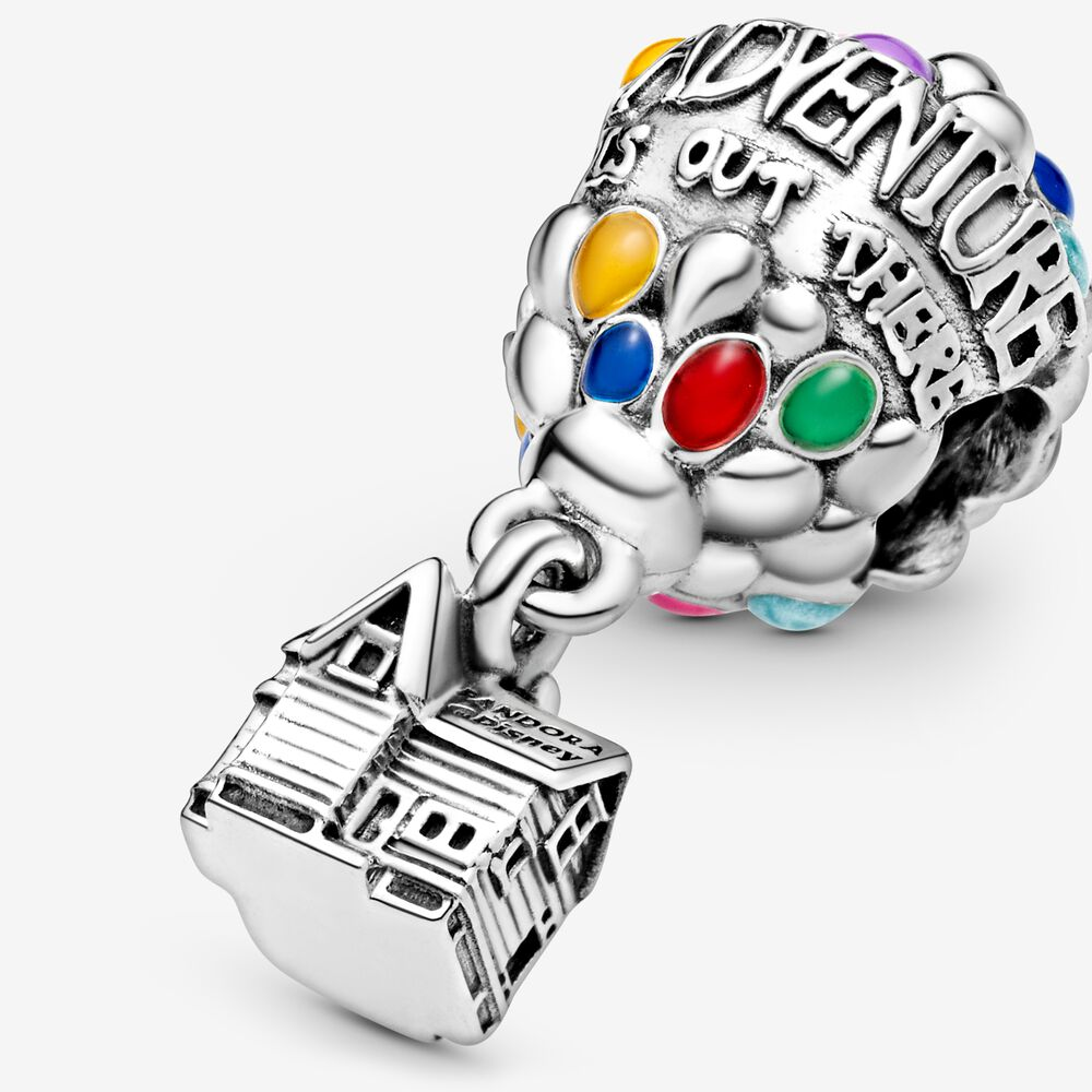 Get ready to go on a journey of a lifetime with Disney Pixars Up House & Balloons Charm. The colourful charm features a bundle of hand-applied enamel princess blue, light blue, mandarin orange, pale cerise, vibrant green, purple and magenta balloons carrying the sterling silver dangle house that Carl uses to go on his fantastic journey. Raised letters amongst the many colourful balloons add an inspirational touch with the statement Adventure is out there.
