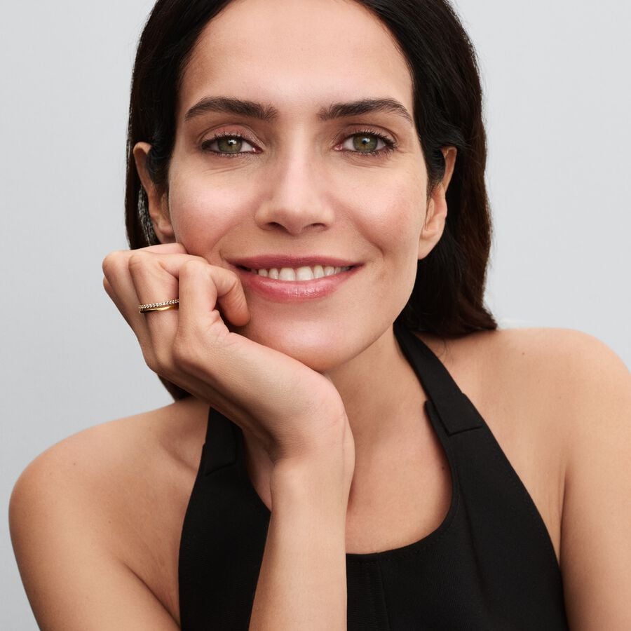 A 14k gold-plated double band features one polished band parallel to a second band set with sparkling pavé. The two bands appear separate but are actually connected, creating an eye-catching juxtaposition of different textures and materials.