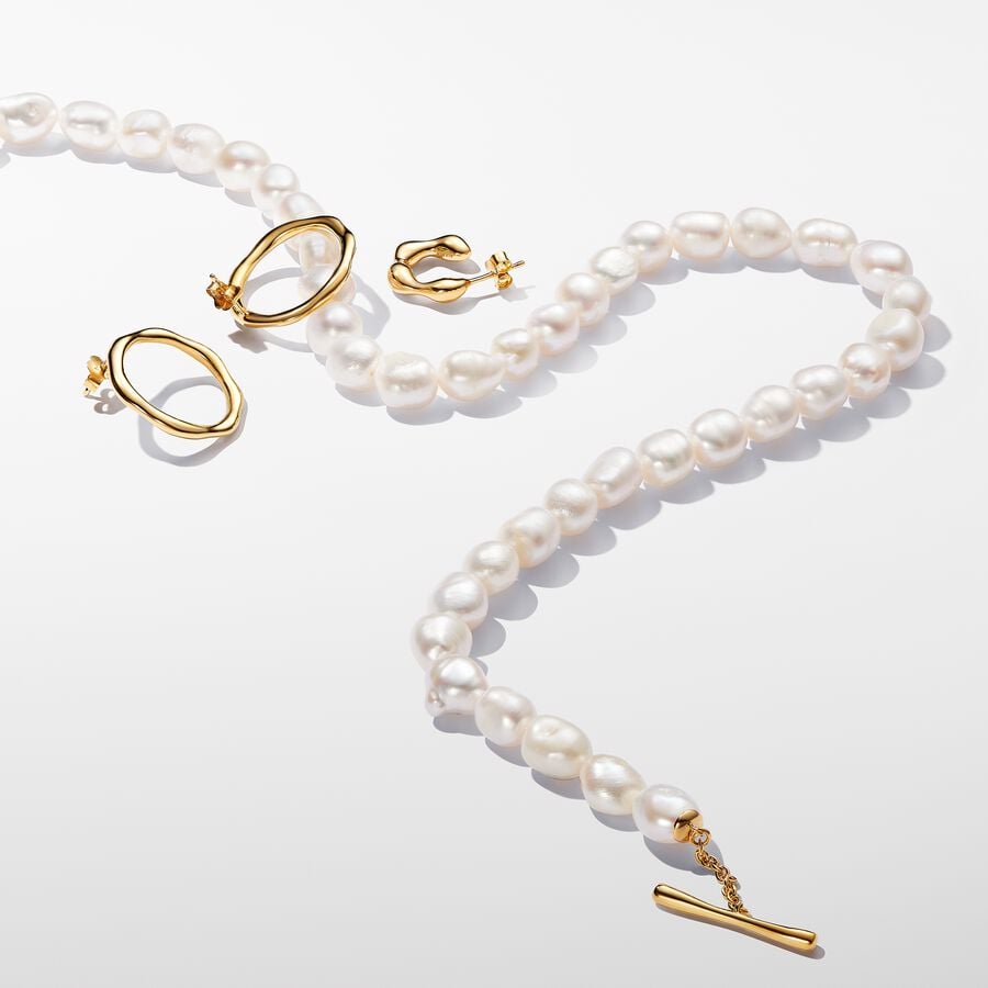 Introducing a new kind of classic with the Baroque Treated Freshwater Cultured Pearls T-bar Collier Necklace. This necklace features a row of baroque treated freshwater cultured pearls and closes with an organically-shaped 14k gold-plated T-bar closure.