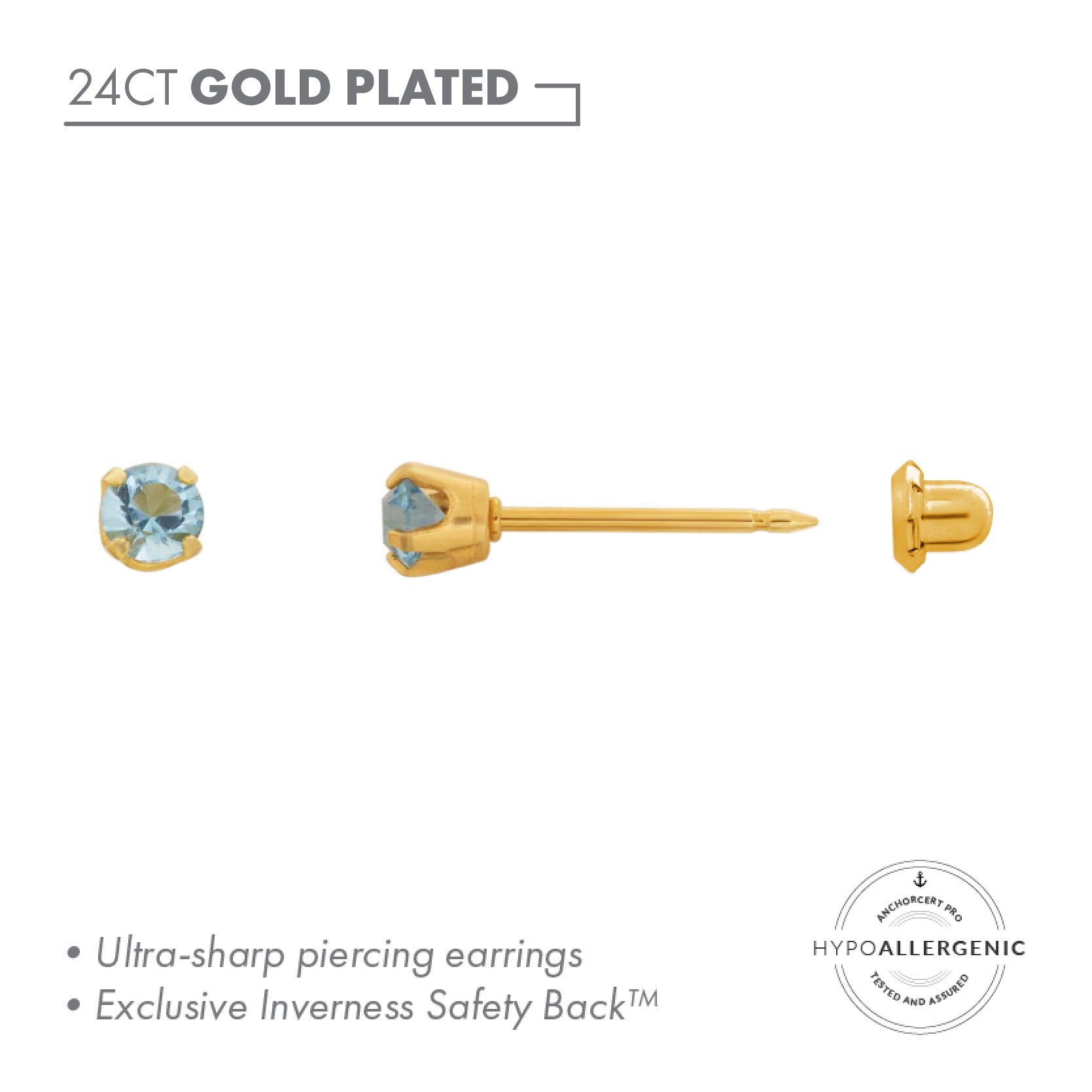 These earrings feature 3mm round aquamarine cubic zirconia stones in a four claw setting, and are crafted from stainless steel with a 24ct yellow gold plating, providing a premium product at an affordable price point. Part of our ear piercing range- made specifically for new piercings only and to be purchased alongside our Ear Piercing Experience.