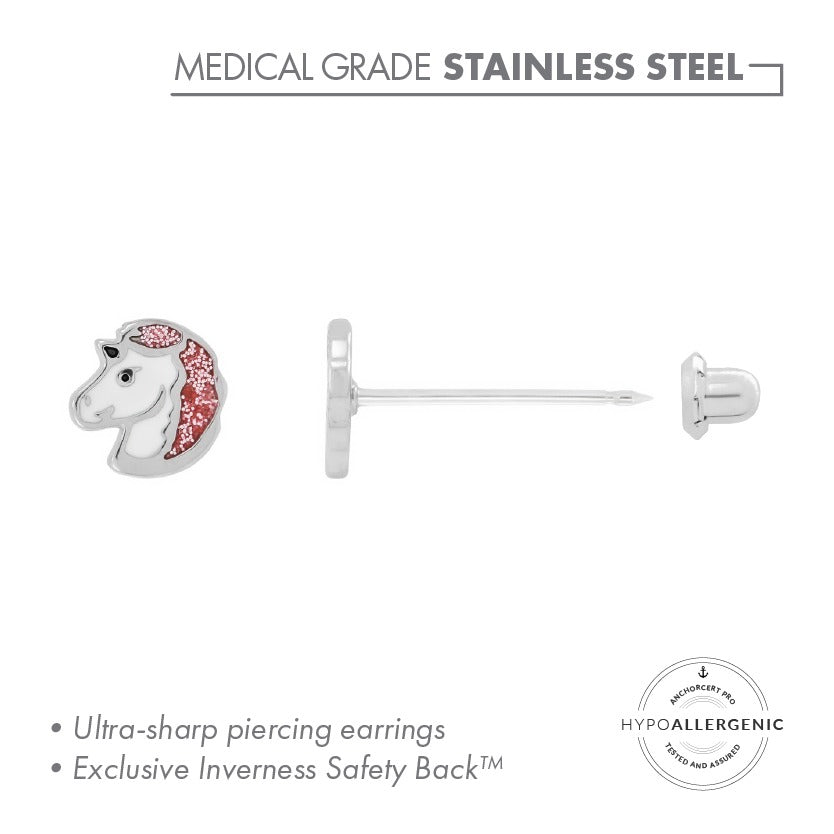This pair of stainless steel earrings features a pink and white unicorn stud with glittery mane, 7mm in diameter. Part of our ear piercing range- made specifically for new piercings only and to be purchased alongside our Ear Piercing Experience.